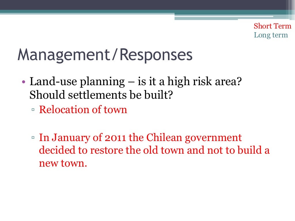 Management/Responses • Development of the volcano prediction systems ▫ Real-time seismic monitoring began on 16th of May 2008, and that was conducted by the USGS (United States Geological Survey). ▫ Chile's geological survey (SERNAGEOMIN) created a new program to improve monitoring at 43 high-threat volcanoes. Short Term Long term 12.