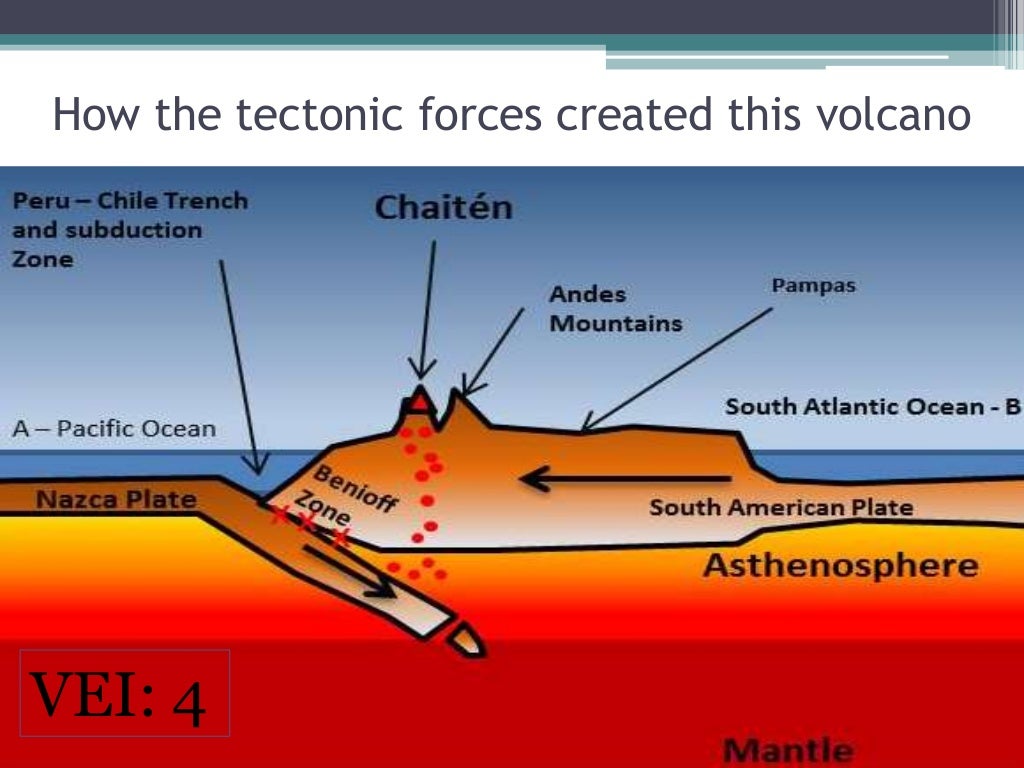 They have distinctive characteristics and can have both positive and negative effects on people and the landscape. Chaiten is a small volcano in western Chile in the Andes fold mountains. Beneath it is a destructive plate margin, where the Nazca plate subducts under the South American plate.